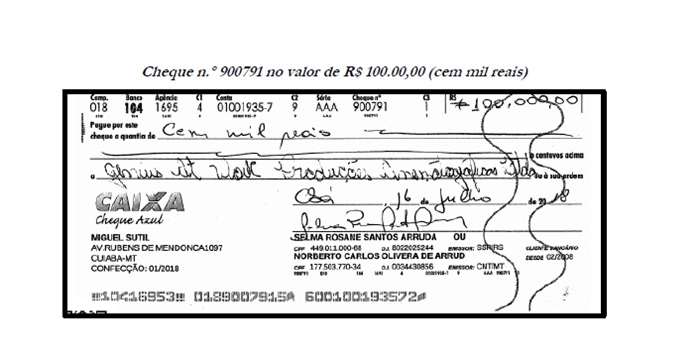 O primeiro cheque (nº 900769) foi emitido no dia 10 de abril no valor de R$ 150 mil. Já o segundo (900779) foi emitido no dia 4 de maio, também no valor de R$ 150 mil. O terceiro (900781), por sua vez, também no valor de R$ 150 mil, foi emitido no dia 25 de maio. O último (900791) foi emitido no dia 16 de julho no valor de R$ 100 mil.