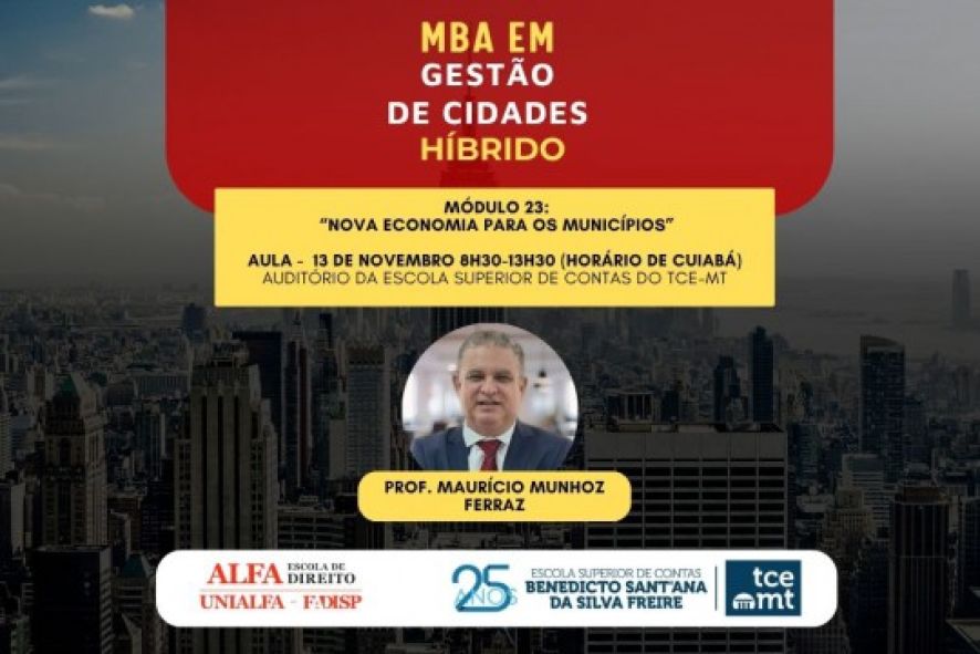 Com foco na “Nova Economia para os Municípios”, o Tribunal de Contas do Estado de Mato Grosso (TCE-MT), em parceria com a Fadisp, realiza o 23° módulo do MBA em Gestão de Cidades, a partir das 8h30 desta sexta-feira (14).