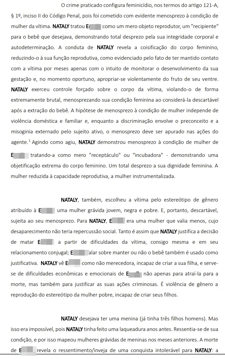 “Nataly tratou [a vítima] como um mero objeto reprodutor, um ‘recipiente’ para o bebê que desejava, demonstrando total desprezo pela sua integridade corporal e autodeterminação. A conduta de Nataly revela a coisificação do corpo feminino, reduzindo-o à sua função reprodutiva”, disse o promotor em trecho do documento.