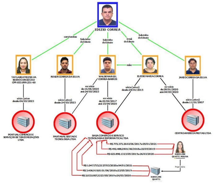O organograma mostra que Tayla Beatriz era sócia do marido na Pontual Comércio. Já o sobrinho Roger Correa era sócio de Edezio na Pantanal Gestão e Tecnologia.