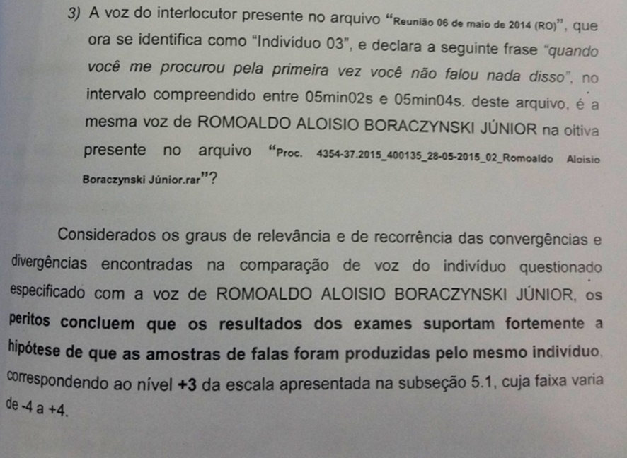 “Considerados os graus de relevância e de recorrência das convergências e divergências encontradas na comparação de voz do individuo questionado especificado com a voz de Romoaldo Aloísio Boraczynski Júnior, os peritos concluem que os resultados dos exames suportam fortemente a hipótese de que as amostras de falas foram produzidas pelo mesmo indivíduos, correspondendo ao nível +3”, afirmou a perícia.