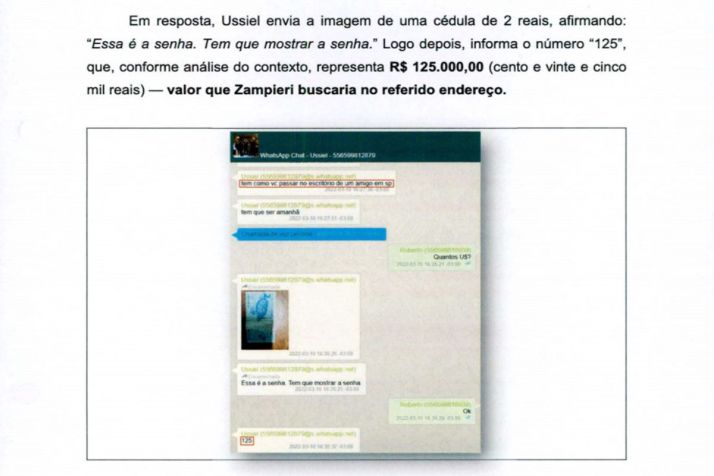 Zampieri respondeu perguntando “Quantos US?”, sugerindo que a operação envolvia moeda estrangeira. Ussiel então enviou uma foto de uma cédula de R$ 2, explicando que se tratava da “senha” a ser apresentada no local de retirada, e complementou com o número “125”, equivalente a R$ 125 mil.