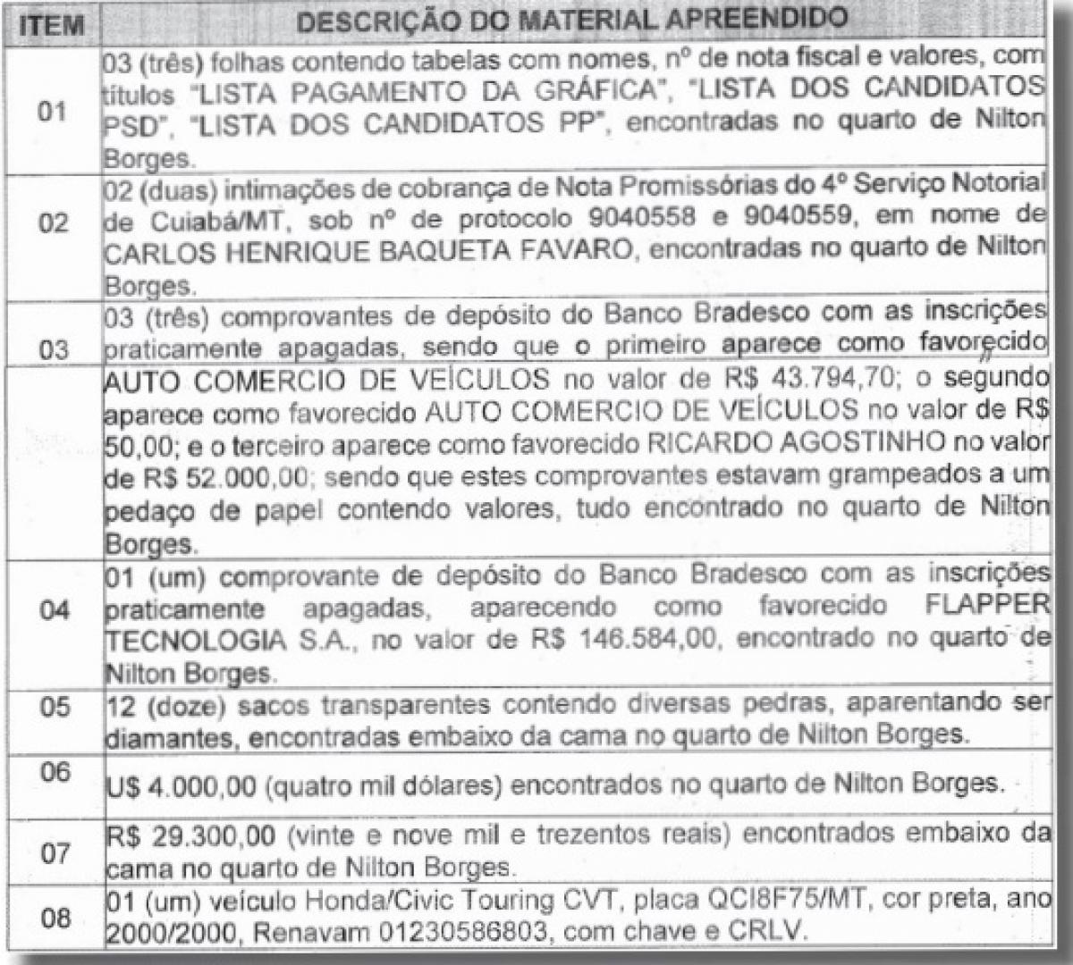 O documento mostra que na casa do ex-secretário no Residencial Harmonia, em Cuiabá, foram encontrados – e apreendidos - embaixo da cama doze sacos transparentes contendo diamantes e R$ 29,3 mil. No quarto do ex-secretário ainda foram recolhidos US$ 4 mil.