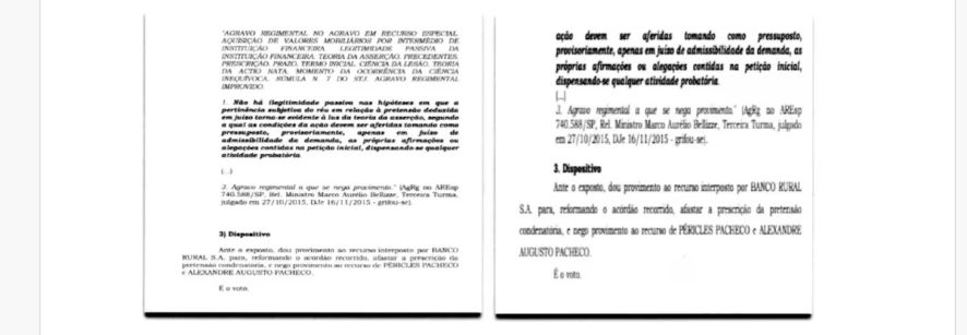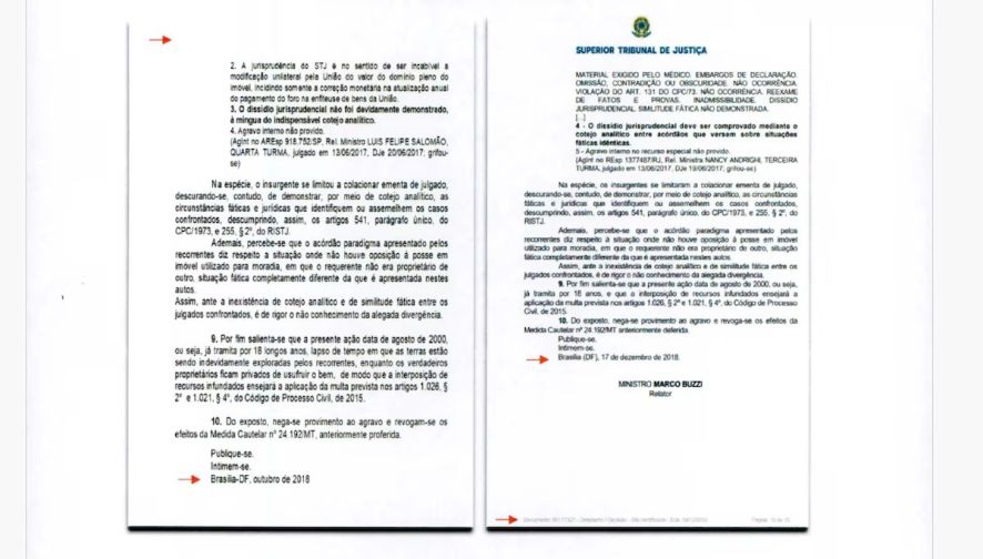 Um dos novos documentos identificados foi uma minuta de voto do ministro Marco Buzzi em um processo de uma disputa fundiária em Mato Grosso. O arquivo tinha data de criação de 19 de outubro de 2018, mas o ministro só proferiu efetivamente a decisão dois meses depois. De acordo com a PF, os documentos tinham diversos “trechos coincidentes”.