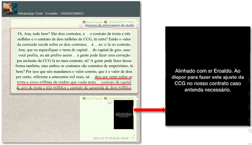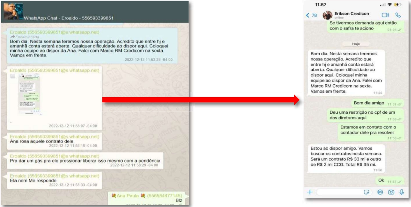Eroaldo, então, envia a ela dois prints da conversa que teve com o sócio-administrador da Arche, na qual ele também dá informações sobre sobre a suposta transação.