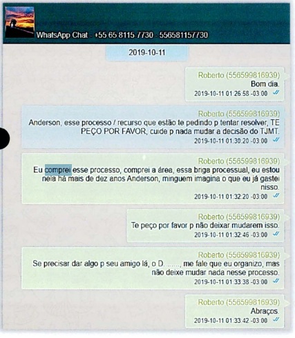 As conversas interceptadas, entre outubro e novembro de 2019, mostram pedidos de verificação do andamento do processo e referências explícitas a pagamento para a obtenção do resultado desejado.