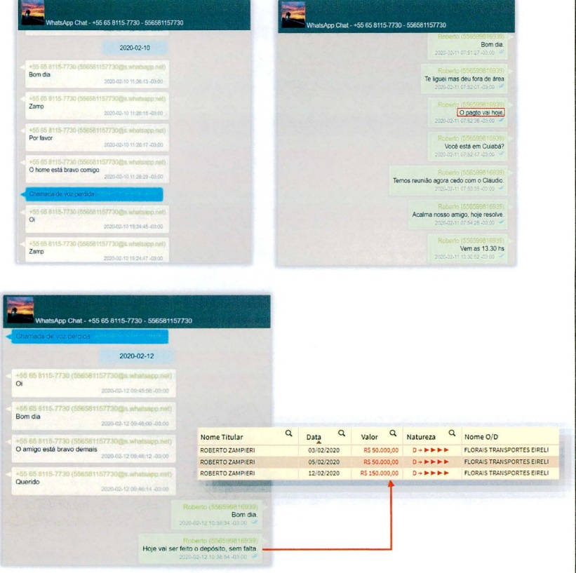Nos sucessivos dias, as mensagens interceptadas registraram novas cobranças, com Andreson exigindo o total de R$ 200 mil — sendo R$ 50 mil já pagos e R$ 150 mil ainda pendentes. As transferências confirmadas pela PF mostram que, em 6 de dezembro, Zampieri recebeu R$ 50.000,00 do cliente Carlos Antônio Nogueira Júnior, representante do espólio por ele defendido, valor imediatamente repassado à empresa Florais Transportes, de propriedade de Andreson.