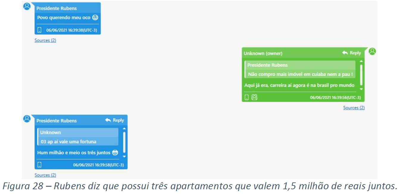 “Aqui já era, carreira aí agora no Brasil pro mundo”, fala o ex-consultor, se referindo ao último comentário de Rubens, que por último escreve que os imóveis valem “um milhão e meio os três juntos”.