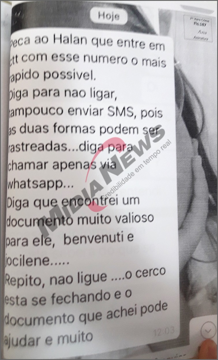 “Diga para não ligar, tampouco enviar SMS, pois as duas formas podem ser rastreadas [...] Repito, não ligue... o cerco está se fechando e o documento que achei pode ajudar e muito”.