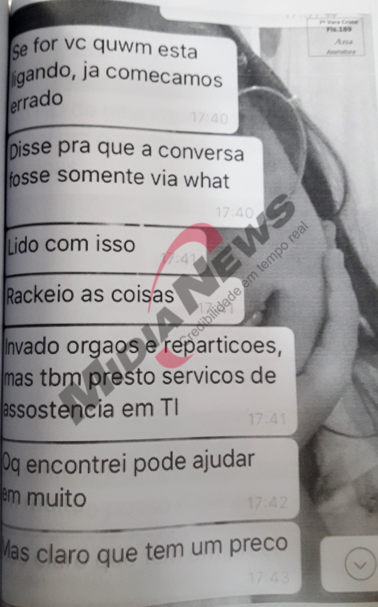 O autor da chantagem disse que “hackeava” órgãos e repartições e o documento que encontrou poderia ajudar Hallan. Nas mensagens, o policial enviou fotos de trechos do inquérito sigiloso, inclusive gráficos e imagens do monitoramento conduzido pelo Gaeco contra o delator, que hoje constam na ação penal.