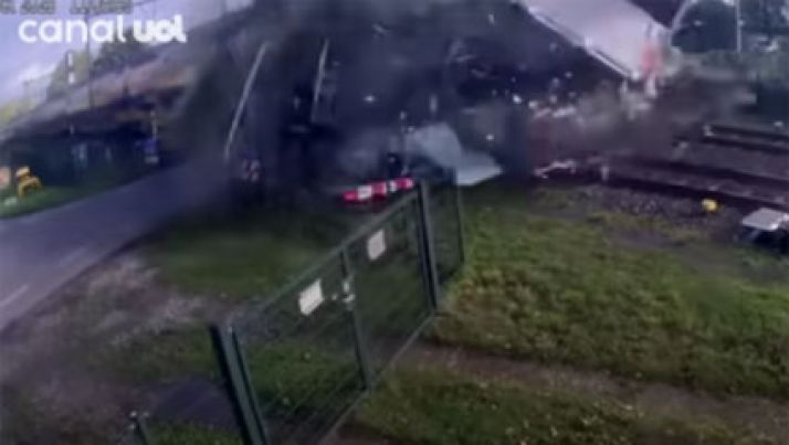 Trem bate em caminhão de peras, destrói veículo e espalha frutas; veja acidente