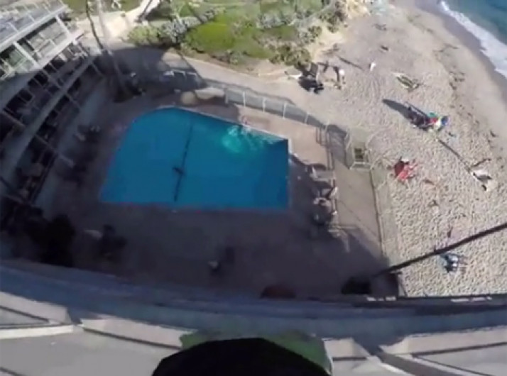 Homem sobe na cobertura de um prédio e pula na piscina