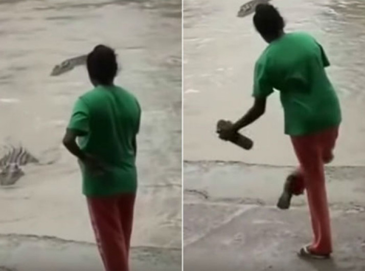 Mulher espanta crocodilo usando um chinelo na Austrália