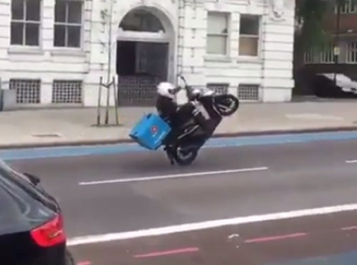 Entregador de pizza tenta empinar moto e leva tombo em Londres