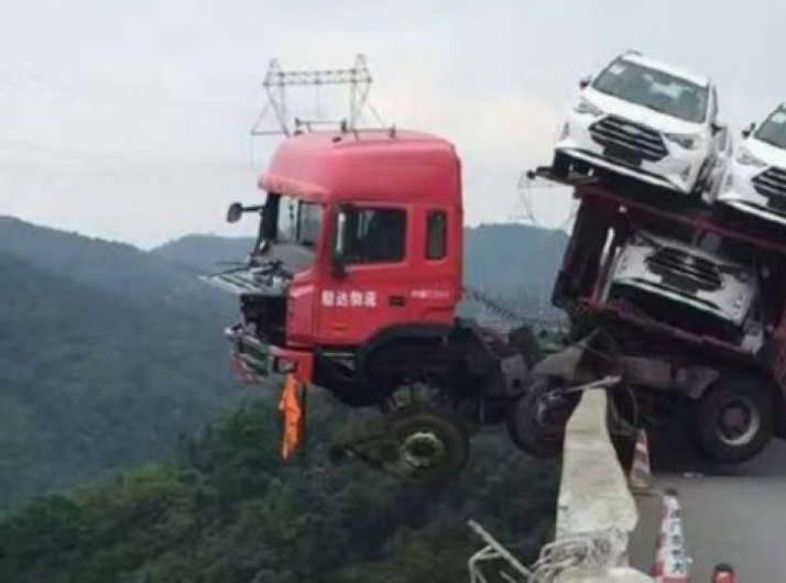 Caminhão-cegonha fica pendurado a 150 metros de alturaa na China