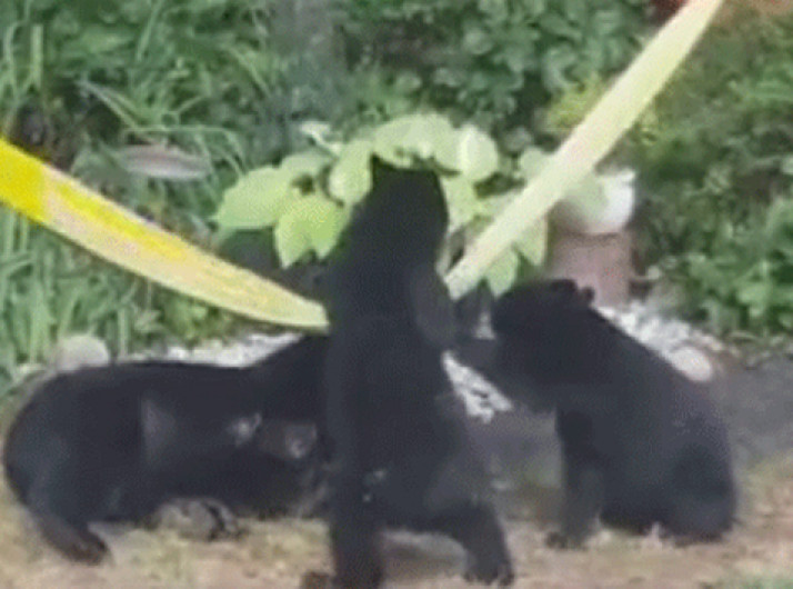 Família de ursos brinca com rede em quintal de casa no Canadá