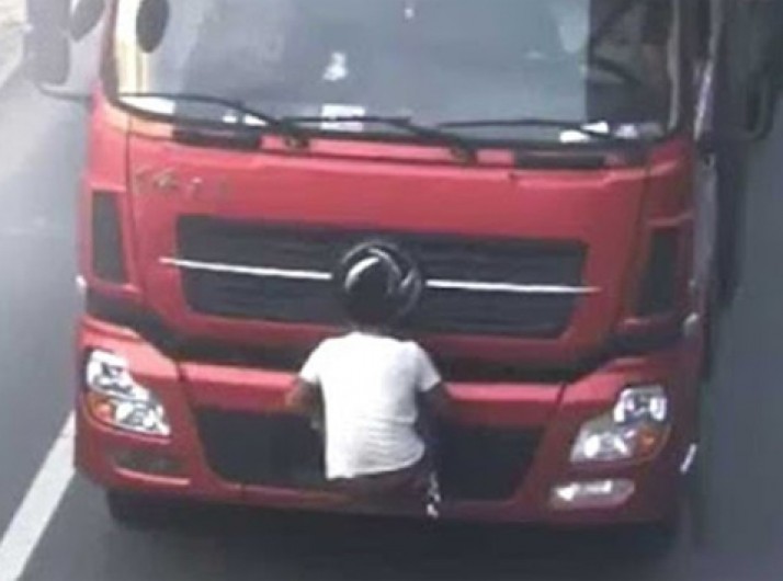 Chinês põe amigo em para-choque para esconder placa de caminhão