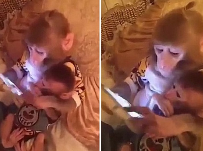Macaca cuida de filhote enquanto mexe em celular e vídeo viraliza