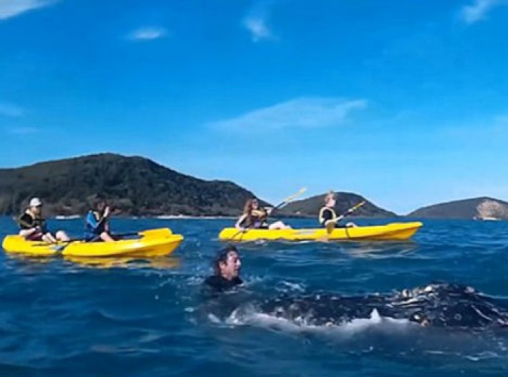 Baleia se aproxima e “pede ajuda” a canoístas para se livrar de corda