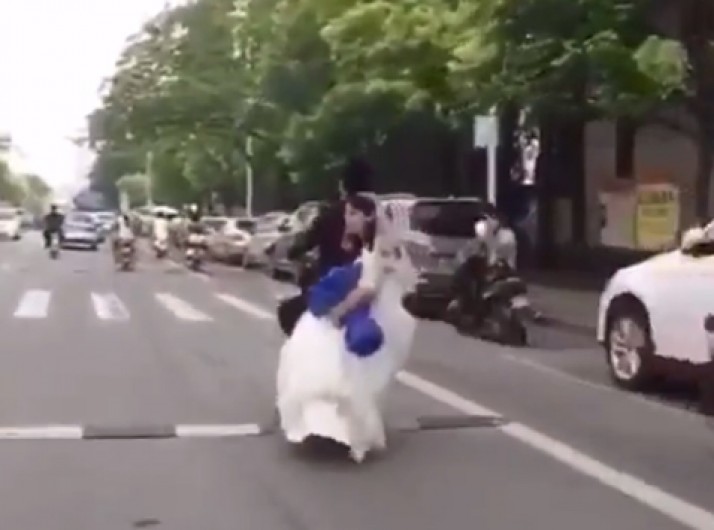 Recém-casados deixam igreja em bicicleta elétrica e noiva leva tombo