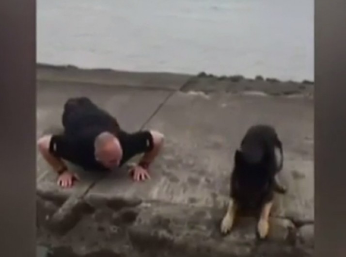 'Flexão de pata': cão acompanha policial em desafio por doações