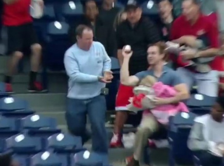 Pai pega bola de beisebol enquanto segura filha no colo e vira hit na web
