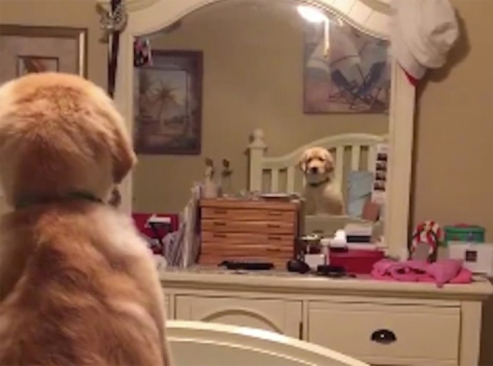 Cachorrinho não reconhece seu reflexo no espelho e fica confuso