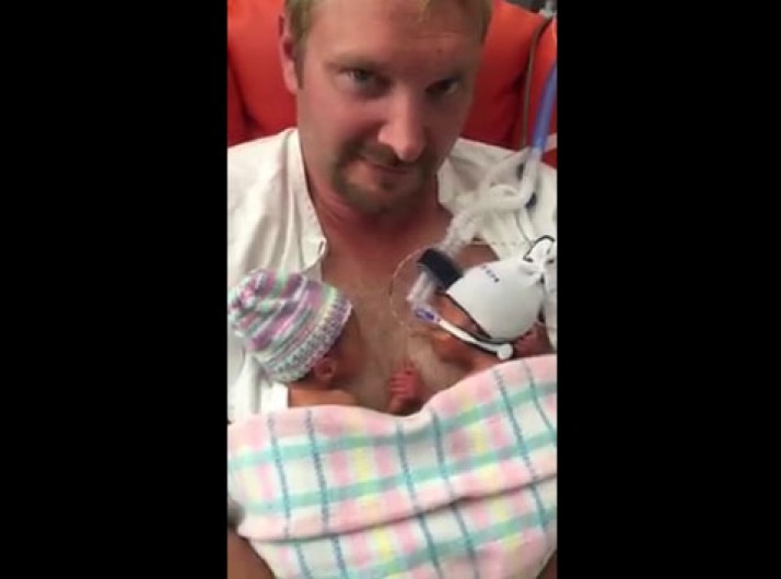 Gêmeos dão as mãos enquanto descansam no peito do pai