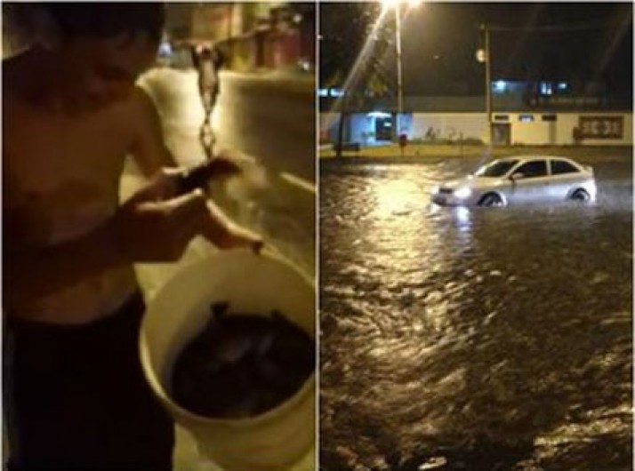 Após chuva, moradores "pescam" nas ruas de João Pessoa