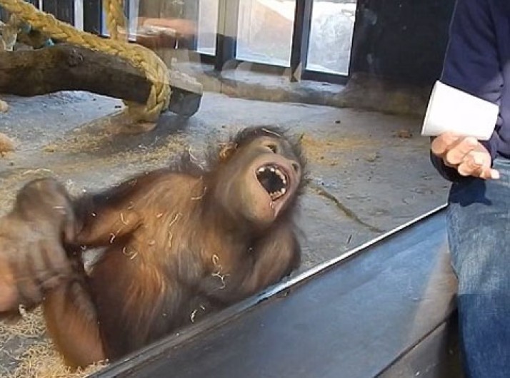 Orangotango "rola de dar risada" após truque de mágica