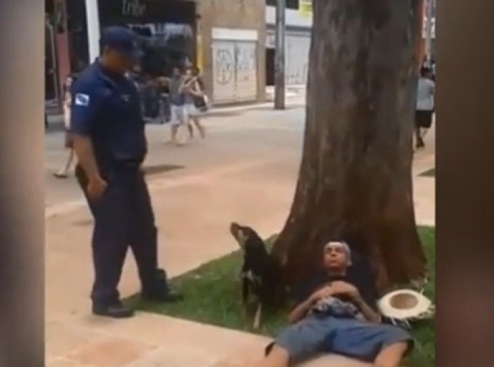 Cachorro avança em guarda municipal que tenta acordar morador de rua