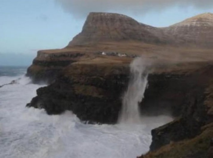 Fortes ventos criam 'cachoeira invertida' nas Ilhas Faroe