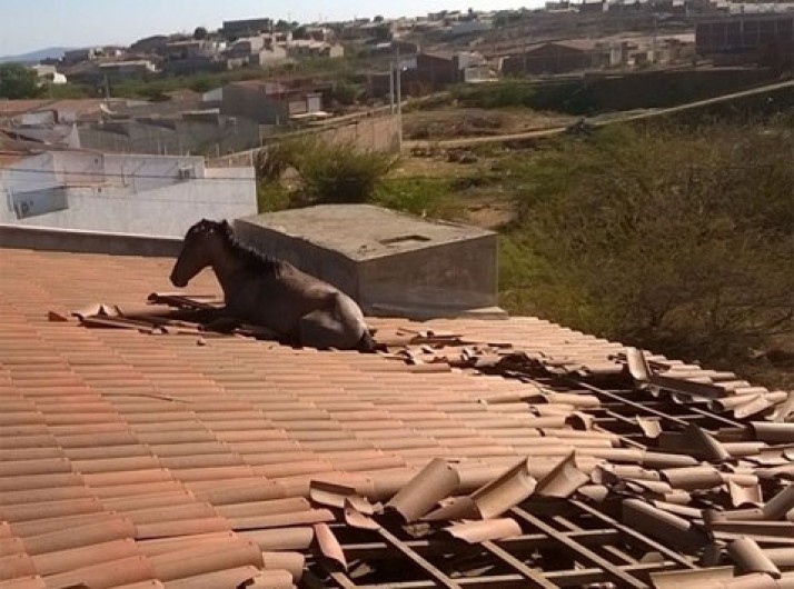 Cavalo 'erra' o caminho e vai parar em cima de uma casa na Paraíba