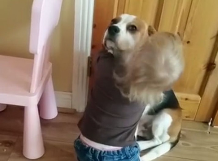 Menina consola beagle que derrubou tigela de cereais