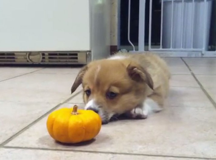Filhote de corgi não se entende com mini-abóbora