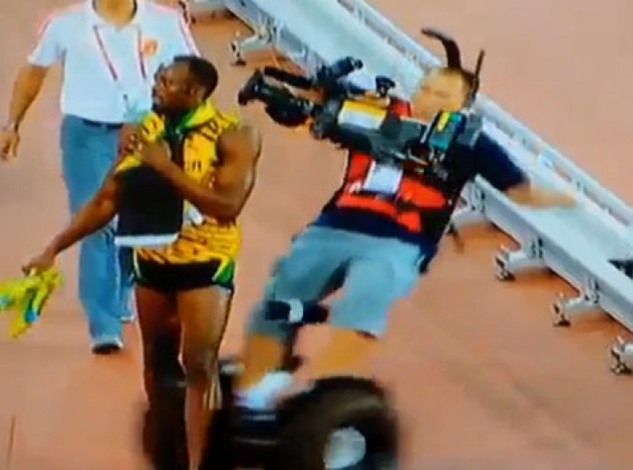 Após ouro, câmera chinês leva tombo feio e dá rasteira em Usain Bolt; veja