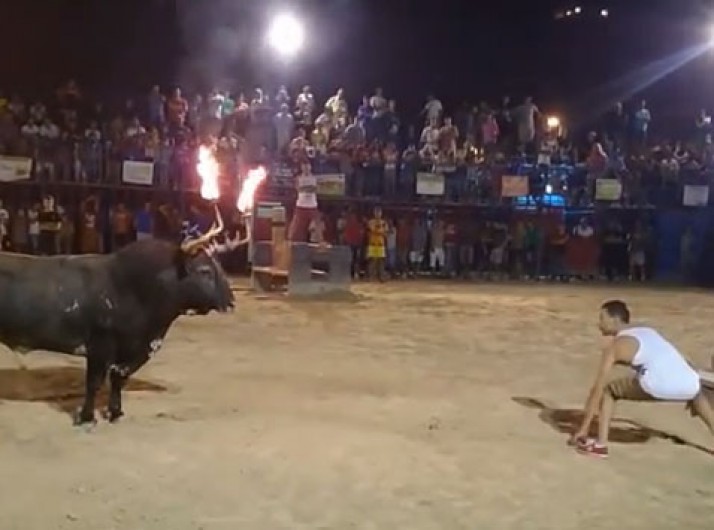 Homem desafia touro com chifres em chamas e acaba desacordado