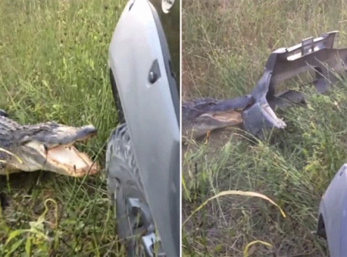 Vídeo incrível mostra jacaré atacando para-choque de caminhonete