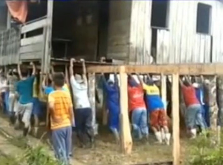 Moradores mudam casa de lugar para fugir da enchente em vila no Amazonas