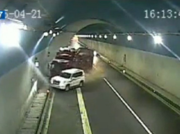 Caminhão tomba em túnel na China após ser fechado por carro; veja