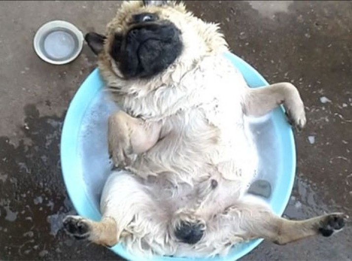 Cão é filmado na maior tranquilidade relaxando em 'ofurô particular'