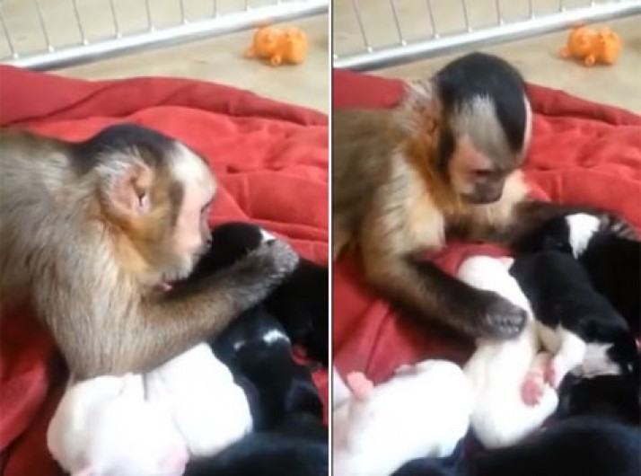 Macaco vira hit após ser filmado fazendo carinho em filhotes de cães