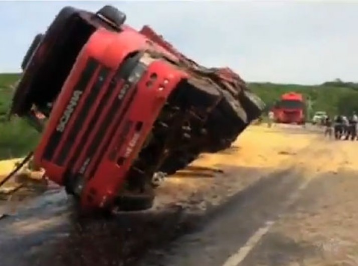 Duplo acidente: caminhão é desvirado e cai em ribanceira em seguida