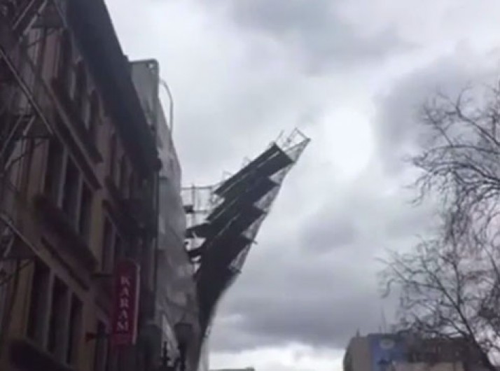 Ventos de 100 km/h arrancam andaime de prédio; ninguém se feriu