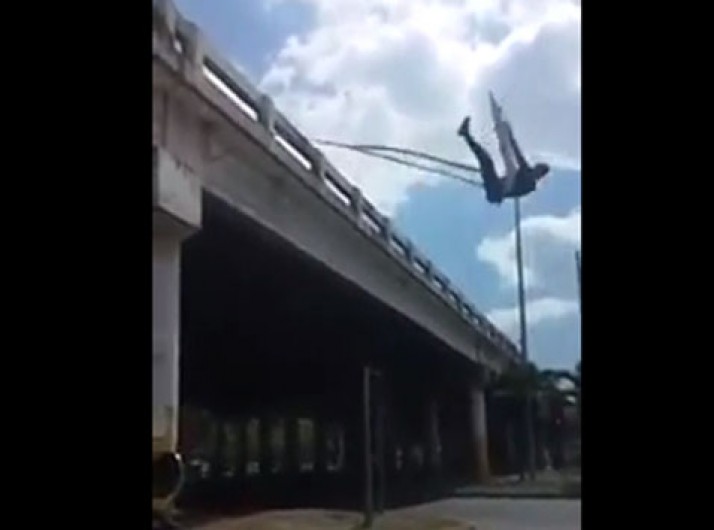 Bizarro: homem-aranha se arrisca em malabarismos em viaduto