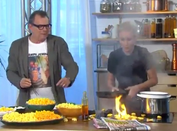 Apresentadora de TV se atrapalha e causa pequeno incêndio