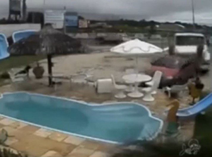 Em Fortaleza, caminhão desgovernado invade loja e joga carro na piscina