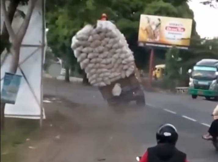 Em avenida movimentada, caminhão tomba com excesso de carga; veja