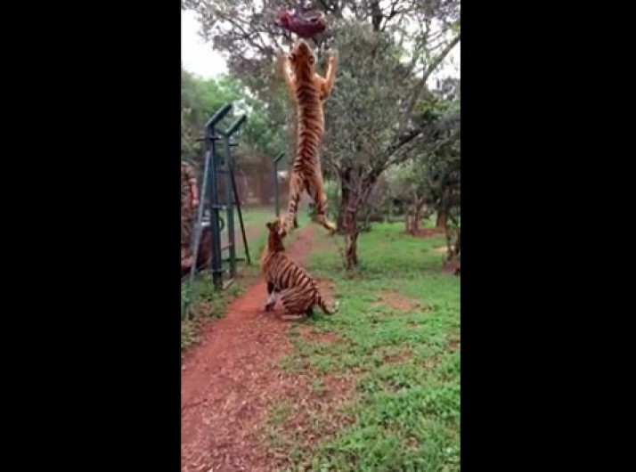 Tigre dá salto épico para pegar naco de carne no ar