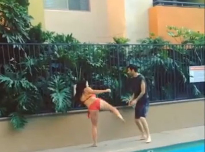 Mulher libera o Bruce Lee interior na beira da piscina
